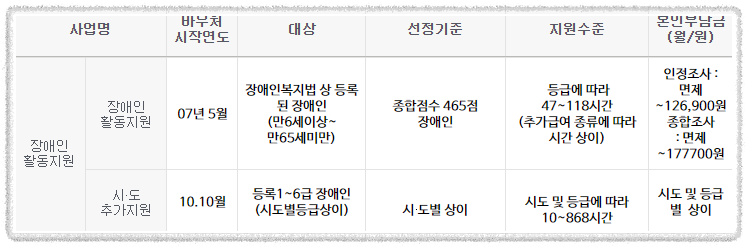 - 신체적 또는 정신적인 장애로 혼자서 일상생활이나 사회생활이 어려운 중증장애인에게 활동지원서비스 제공