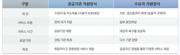 - 수요자 중심의 직접 지원방식으로 바우처(서비스 이용권) 제도를 도입