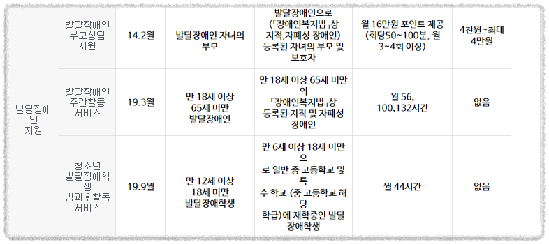 - 성장기 정신적.감각적 장애아동의 인지, 의사소통, 적응행동, 감각 운동 등의 기능향상과 행동발달을 위한 발달재활서비스 지원